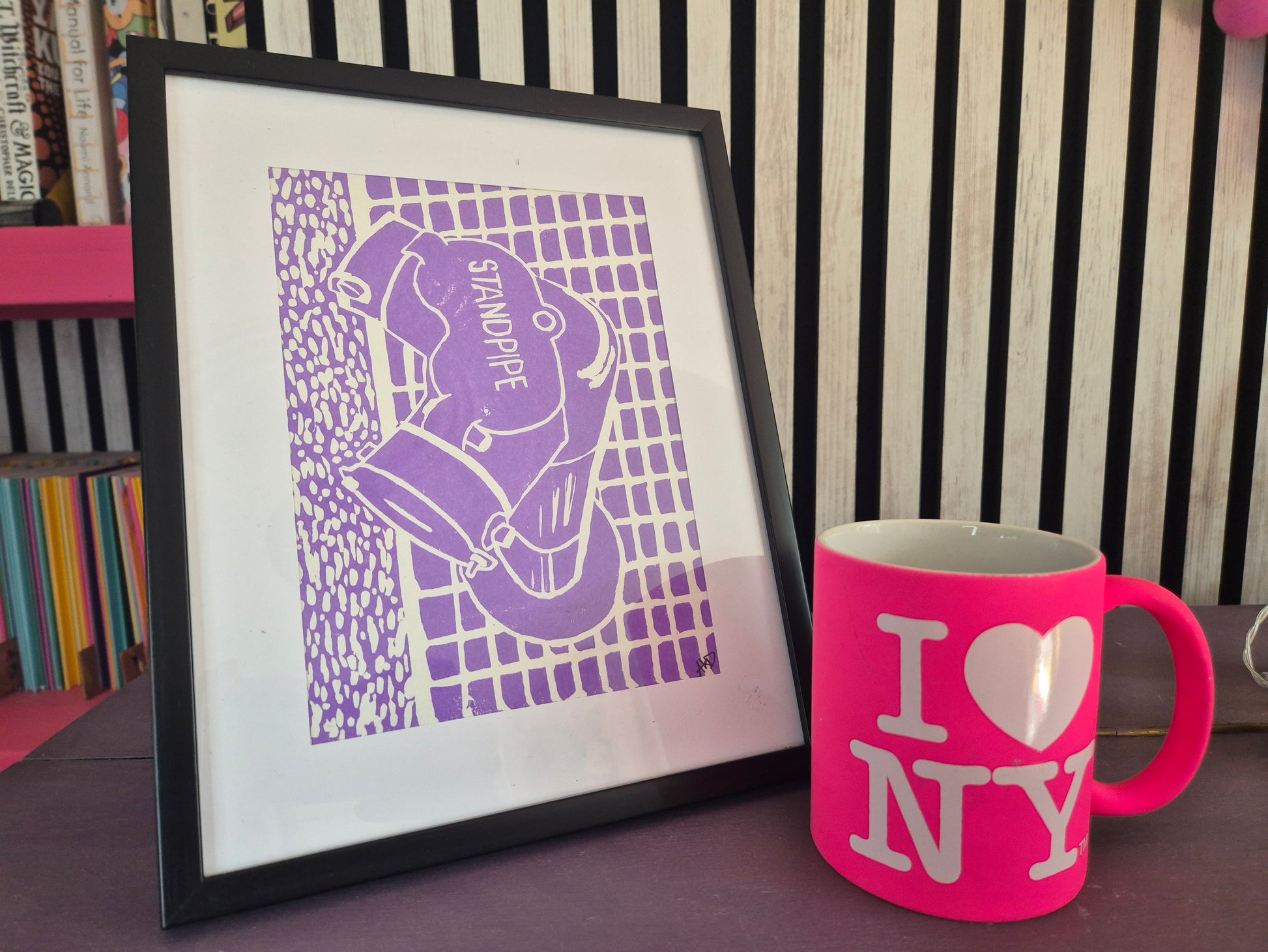 Add a splash of purple pride to your walls with this playful lino print featuring an iconic New York standpipe. This image was originally captured at The Oculus at World Trade Centre. This quirky design combines city vibes with a touch of colourful creativity, making it a fun and unique piece to brighten up any room or office!